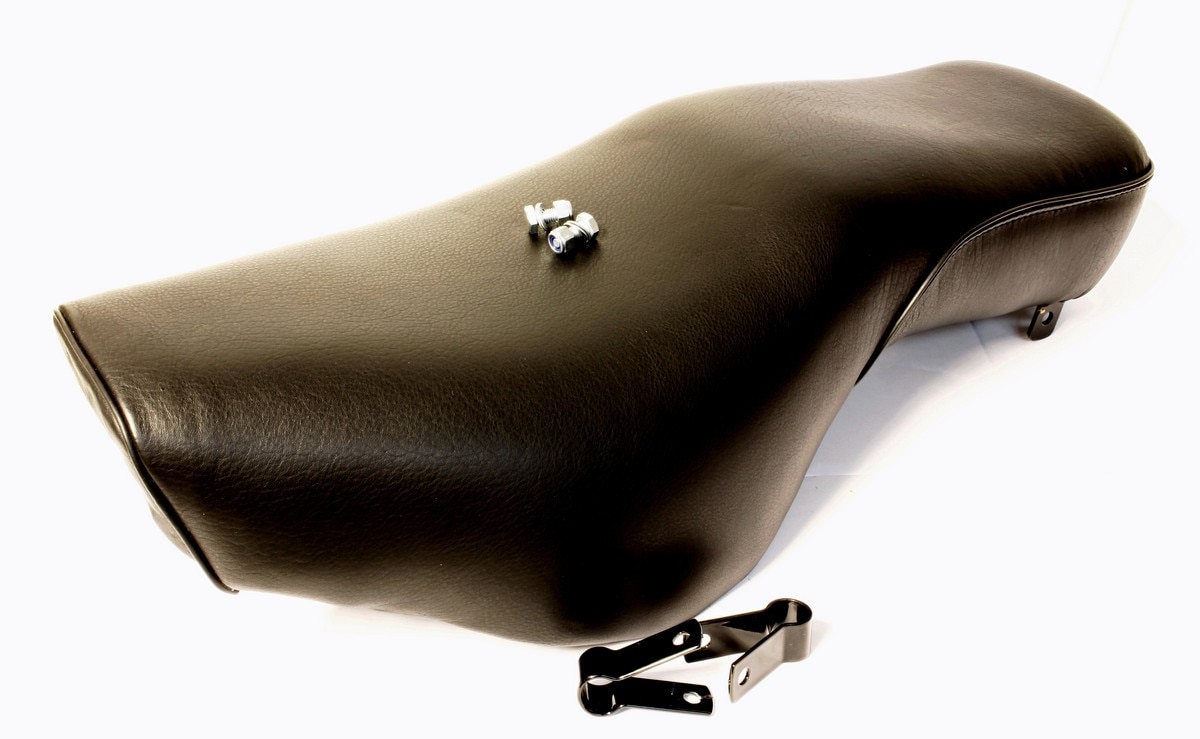 A comfortable, Indian made, budget seat in a similar style to those fitted to the earlier Redditch made models. Available in black with either white piping or black piping.
