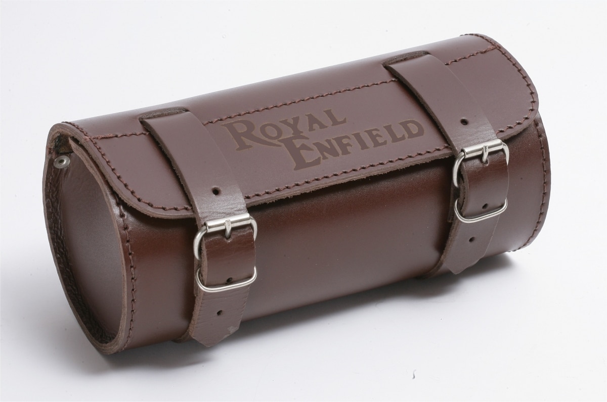 These tool rolls are made from a thick hide and are available in black or brown and with, or without, "Royal Enfield" embossed into them. Approximately 12cm diameter by 25cm long and held on by 2 straps. They are designed to strap on to the fork legs (if suspension travel allows), but can be fixed behind the seat or in any other suitable place.