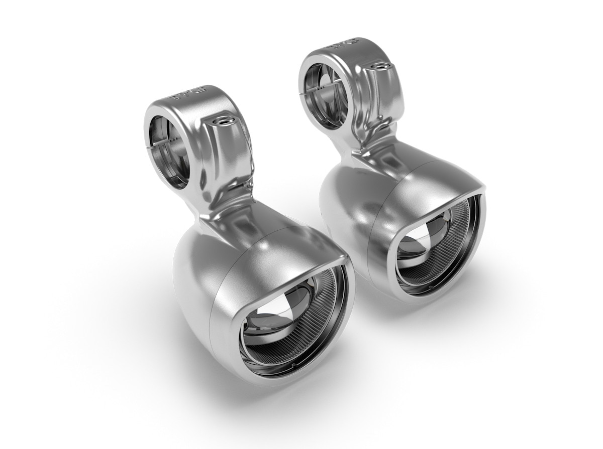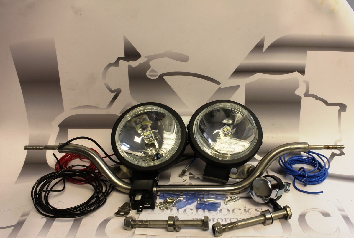 This kit consists of a stainless steel bolt-on bracket and small 3" spot lights. The kit is available with 55watt halogen bulbs for greater visibility during night riding (only suitable for EFI models) or LED bulbs which can be used as daytime running lights.